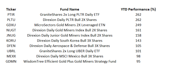 상위 10위 중 3, 4, 5위를 금 채굴 관련 레버리지 ETF들이 차지했습니다. MicroSectors Gold Miners 2X Leveraged ETN(GDXU)는 249%, Direxion Daily Gold Miners Index Bull 2X Shares(NUGT)는 161%, Direxion Daily Junior Gold Miners Index Bull 2X Shares(JNUG)는 158%의 수익률을 기록했습니다.