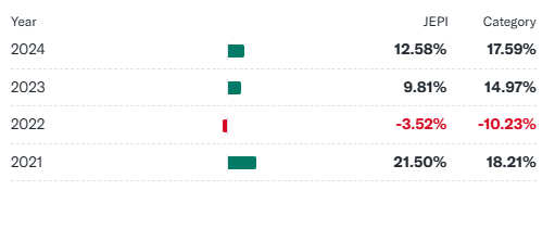 이는 JEPI가 강세장보다는 완만한 상승장이나 횡보장에서 상대적으로 더 나은 성과를 보인다는 것을 의미합니다.