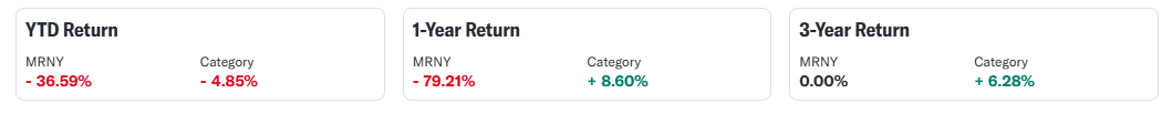 A: MRNY는 고위험 투자상품입니다. 높은 배당률 이면에 상당한 원금 손실 위험이 있으며, 현재까지 YTD -38.6%의 손실을 기록하고 있습니다.