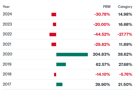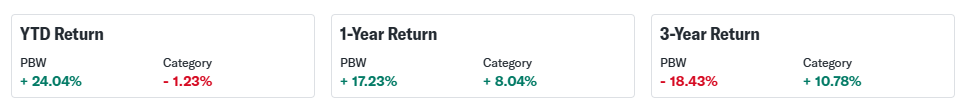 2024년 4월 말부터 현재까지 PBW ETF는 58.1%라는 경이로운 수익률을 기록했습니다. 이는 같은 기간 S&P 500의 16% 수익률을 3배 이상 상회하는 성과입니다.