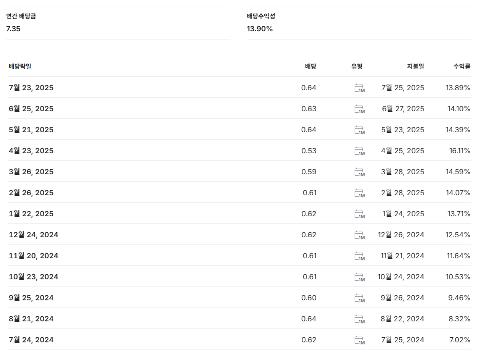 - 최근 배당: $0.6366 (2025년 7월, 전월 대비 3.7% 증가)