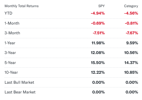 SPY ETF의 성과는 기본적으로 S&P 500 지수의 성과를 반영합니다: