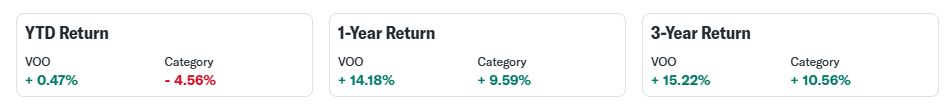VOO ETF의 기간별 수익률은 다음과 같습니다(2025년 5월 15일 기준, 배당금 재투자 가정):