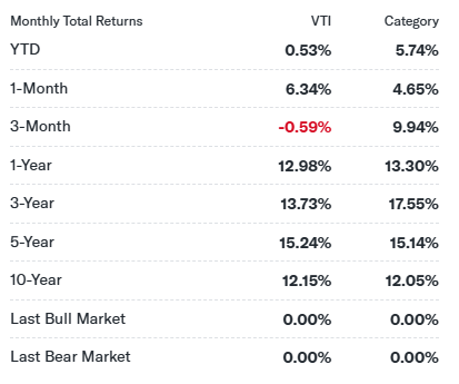 VTI의 최근 1년 수익률 12.98%는 미국 주식시장의 견고한 성장을 반영합니다. 이는 S&P 500과 비슷한 수준으로, 대형주 중심의 시장 상승을 잘 보여줍니다.
