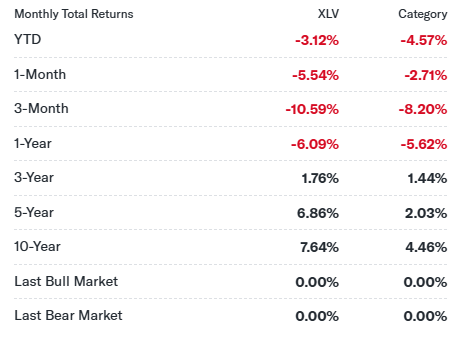 XLV는 설정 이후 연평균 8.16%의 수익률을 기록했으며, 지난 1년간 배당 포함 총 수익률은 -4.95%를 나타냈습니다. 1년간 성과는 -6.27%를 기록했습니다.